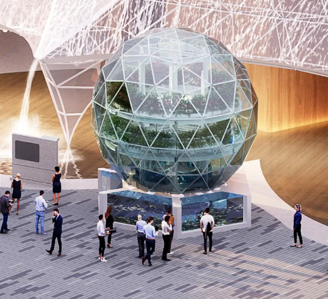 Known as the “Source of Life” dome, this structure shows how food production could move onto rooftops, schools, and apartment buildings instead of relying only on distant farms.